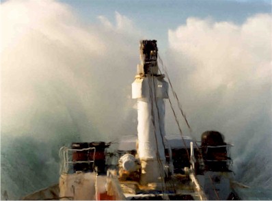 In the summer of 1998 sailing North off the coast somewhere between Mexico and California we encountered some very huge waves, too big to make you seasick, but just enough to take your feet out from under you! I gave my camera to my friend Marco who was on bridge duty and asked him to take a few pictures and the water as it crashed over the bow